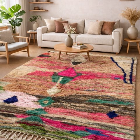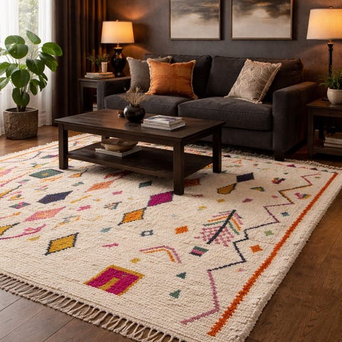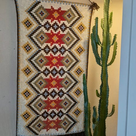 Flott dekorativt vevd veggteppe / åkle med vakre geometriske mønstre i varme farger som rød, oker, grønn og naturtoner. Et karakterfullt tekstil som gir liv og personlighet til rommet.