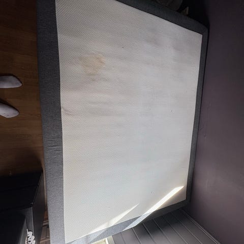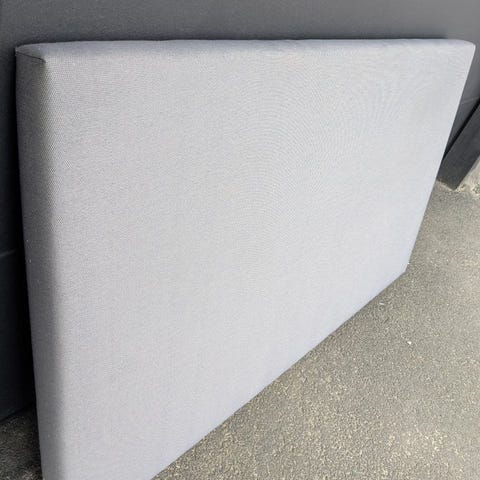 Sengegavl høyde 107 cm, bredde 180 cm. Kledd i gråblå stoff