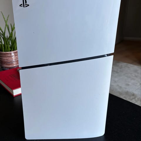 Sony Playstation 5 spillkonsoll i hvit farge. Konsollen støtter spill og underholdningstjenester utviklet for Playstation 5-plattformen. Enheten har vertikal formfaktor og frontpanel med porter for tilkobling av tilbehør. Egnet for bruk med kompatible Playstation 5-spill, kontrollere og annet tilbehør som følger samme standard. Kontroll følger med