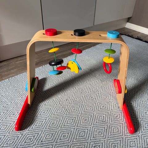 IKEA babygym i tre med hengende leker i flere farger. Egnet for små barn som ligger på rygg eller mage og trener motorikk, hånd-øye-koordinasjon og sansestimulering. Meget pent brukt.
