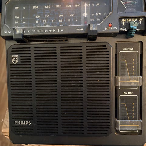 Philips bærbar radio med innebygd høyttaler og uttrekkbar teleskopantenne. Enheten har manuell innstilling av frekvens via dreiehjul på fronten og tydelig skala for kanalsøk. På siden er det bærestropp for enkel transport. Radioen drives trolig av batterier og er egnet til bruk innendørs eller på reise der det er behov for enkel mottak av radiosendinger.