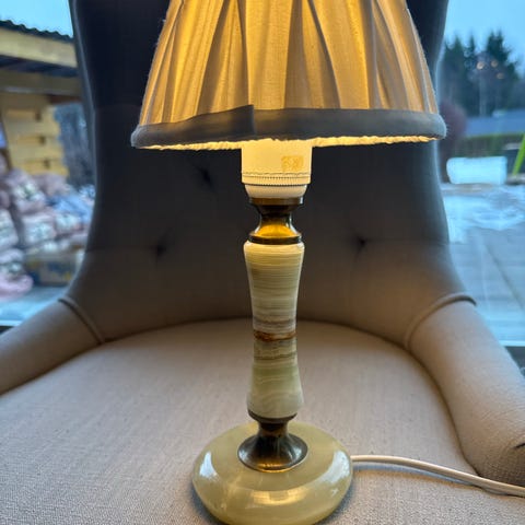 Selger en vakker og stilren bordlampe utført i ekte naturstein (onyks). Dette er et klassisk vintage-objekt, sannsynligvis fra 1960- eller 1970-tallet, som gir ethvert rom et lunt og eksklusivt preg.