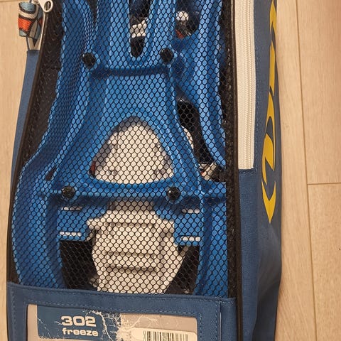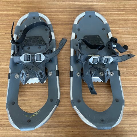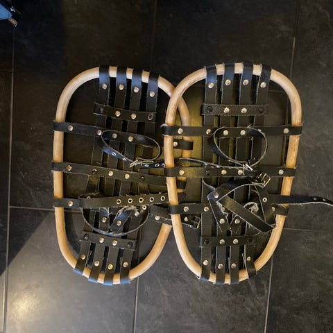 Truger i tre med svarte lærreimer. Rektangulær/oval form med flere justerbare remmer for feste rundt sko eller støvler.
