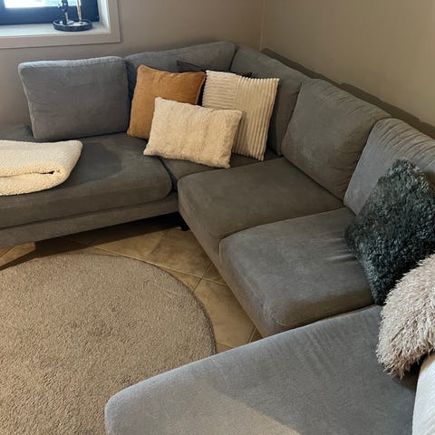 Veldig god å sitte på. Pent brukt. Trekkene er avtagbar og vaskbar. Følger med puff