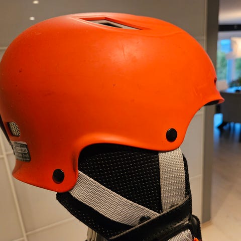 RED hjelm i grå farge med grafisk bymotiv rundt hele hjelmen. Hjelmen har mykt, polstret innvendig fôr og øreputer for økt komfort. Justerbar hakestropp med klipsfeste sørger for at hjelmen sitter stabilt på hodet (klipsfestet er ødelagt, se bilde). Ventilasjonsåpninger i skallet gir lufting under bruk. Egnet som hjelm til ski, snowboard eller annen tilsvarende aktivitet der hodebeskyttelse er nødvendig.
