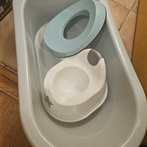 Barnepotte og toalettsete til barn gis bort. Dette er den potten som fungerte best til gutter 😅 Begge er vasket og sterilisert. Hentes på Hoffland