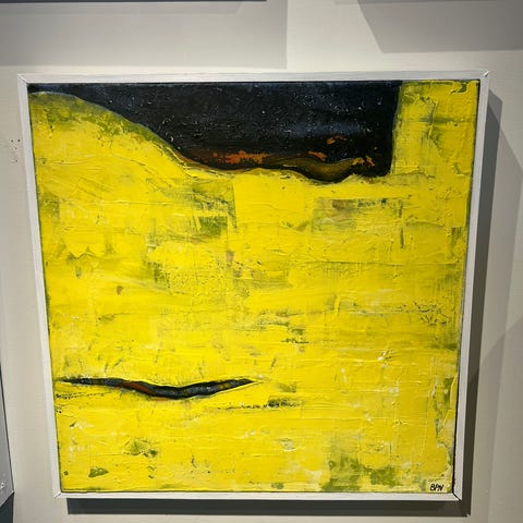 Selger et abstrakt maleri uten tekst, med sterke farger og spraymaling som fremhever motivet. Maleriet er malt på lerret i størrelsen 80 x 60 cm.