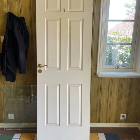 Innerdør i hvit utførelse uten karm og dørhåndtak. Døren har profilert fylling og passer til bruk innendørs, for eksempel i gang, vaskerom eller andre rom i bolig. Klassisk, lys farge som egner seg i de fleste interiører.