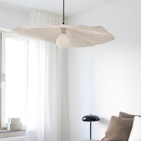 Takpendel med et design som ligner en blomst. Materialet i kronbladene er gjennomsiktig og stabilt, med en tekstur som minner om lin. 2 m tekstilkabel og takkopp i metall. Lampen har en størrelse på 75 cm i diameter.