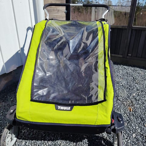 Thule joggevogn brukt til et barn. Vognen har tre store lufthjul, polstret sittedel og justerbare seler. Det er romslig varekurv under setet. Håndtaket har håndbrems og er kledd i skum. Det følger med regntrekk som dekker vognen ved behov.