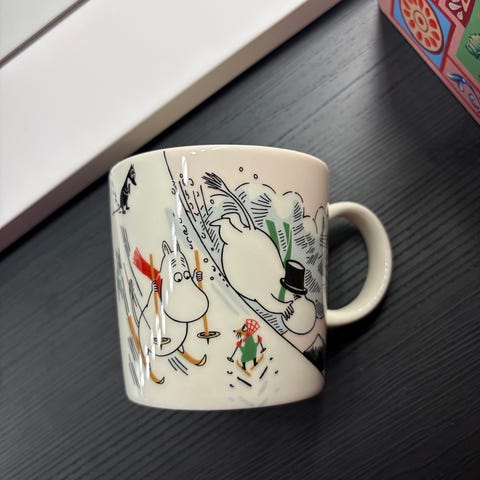 Arabia Moomin kopp med Mummitrollet-motiv i skisport. Kopp i porselen med flerfarget dekor og lys innside. Tåler oppvaskmaskin, mikrobølgeovn og stekeovn (ovn til bord). Årstall 2024 er merket under koppen. Egnet til varme og kalde drikker til daglig bruk.