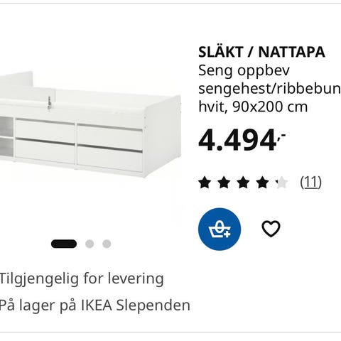 IKEA SLÄKT seng med oppbevaring i hvit utførelse. Sengen har liggemål 90x200 cm og består av en sengramme med lav hodeende og integrerte oppbevaringsløsninger. Under sengen er det flere skuffer for oppbevaring av klær, leker eller sengetøy, samt åpne hyller på siden for lett tilgjengelige ting. Passer som enkeltseng på barnerom, ungdomsrom eller gjesterom der det er behov for ekstra oppbevaringsplass.