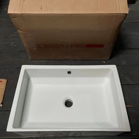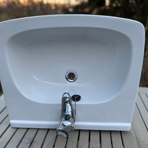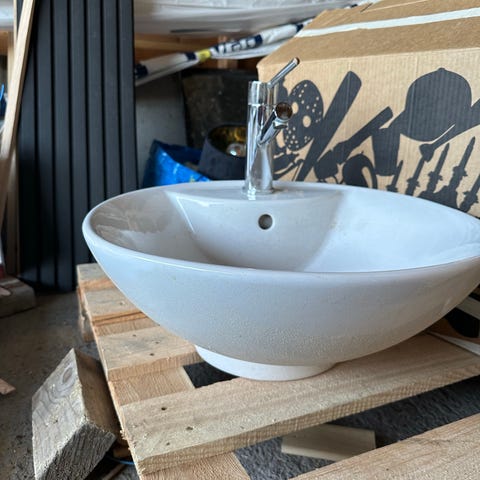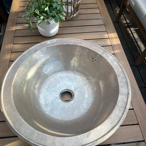 Rund servant i hvit farge med bunnventil. Diameter 45 cm.. Servanten har glatt overflate og er beregnet for montering på benk.