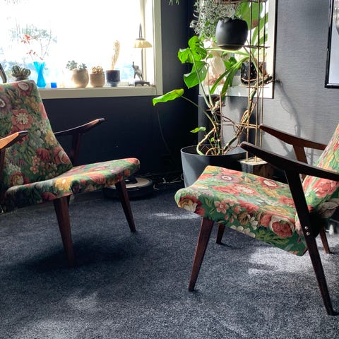 Stolen har heltre ben og armlener, samt et løst saueskinn/lammeskinn lagt over setet og ryggen. Da stoffet dessverre fikk seg en rift da en gjest satt på den med en skarp knapp. Saueskinnet medfølges ikke. Ellers sjekk med en møbelsnekker/tekstil.