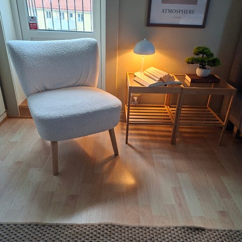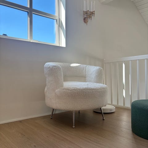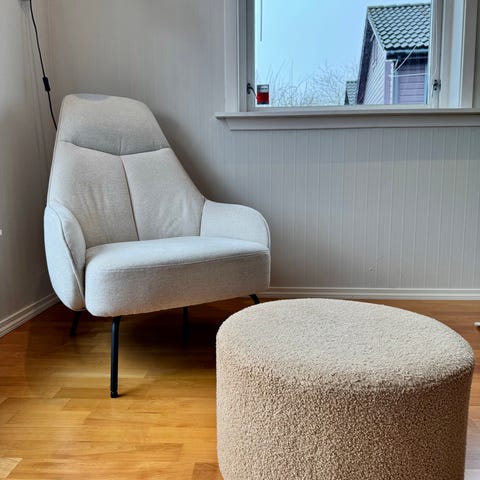 Krakken har rundt sete med tekstiltrekk og treben. Passer som sittegruppe i stue, lesehjørne eller soverom. Begge møblene har et enkelt, tidløst uttrykk med naturmaterialer og myk sittekomfort.
