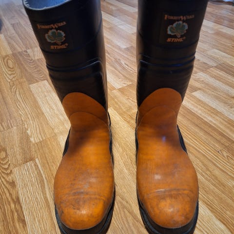 Stihl vernestøvler i oransje og svart, til bruk av motorsag størrelse 43