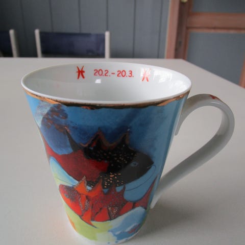 Iittala Taika krus i rødt porselen. Kruset har et dekorativt motiv med fugler og trær i blått, hvitt og andre farger på rød bakgrunn, og hvit innside. Utstyrt med hank. Tåler oppvaskmaskin, mikrobølgeovn, fryser og stekeovn (ifølge merking under kruset). Egnet til varme og kalde drikker som kaffe, te og kakao.