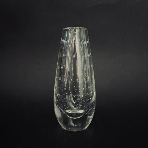 Selger en pen vase med blomstermotiv for kr 125,- Den er 20 cm høy og har en diameter på ca 7 cm på det bredeste . Den er laget ved enten Hadeland eller Magnor Glassverk. Den er hel og pen og framstår som pent brukt / lite brukt .
