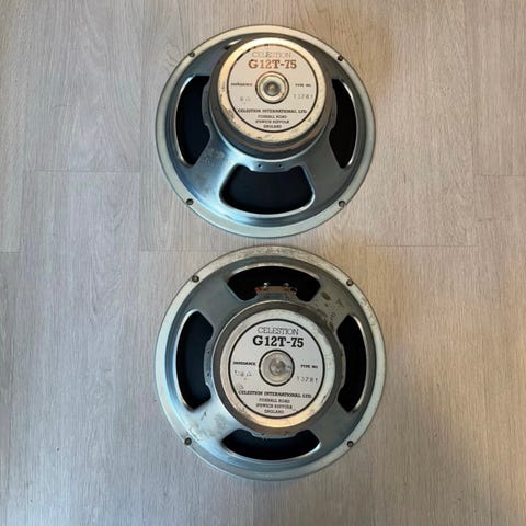 Selger to stk Celestion G12T-75 høytalerelement, 75 watt per element, 16 ohm. Disse er standard høytalere for klassiske Marshall 1960 høytalerkabinett og er faktisk tatt ut fra et Marshall 1960a kabinett.