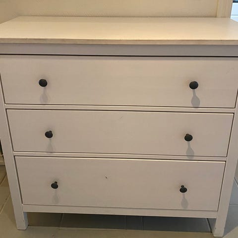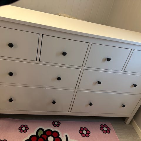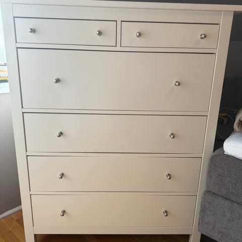 Hvit Hemnes kommode fra ikea. Høy kommode med 6 skuffer. Stått på barnerom og vært brukt til babyklær så denne er pent brukt.