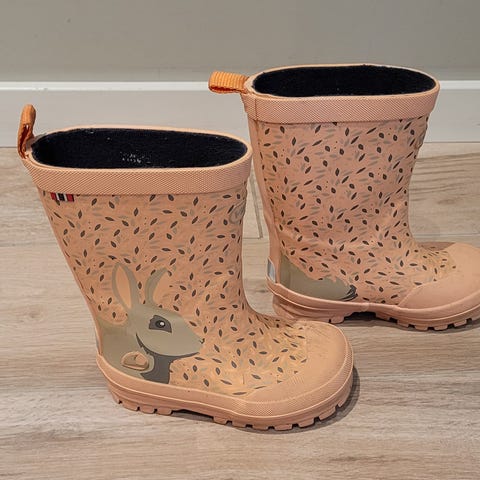 Viking gummistøvler for barn i størrelse 21. Unisex-modell i oransje farge med dyremotiv og mønster. Støvlene har grov såle for godt grep og er laget i vanntett materiale egnet for bruk i vått vær. Passer til hverdagsbruk i barnehage og uteaktiviteter.