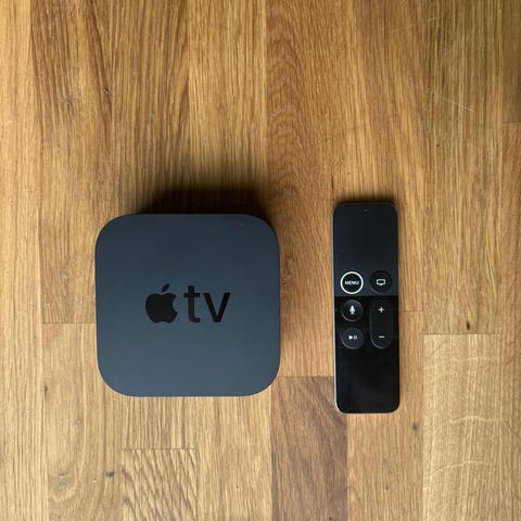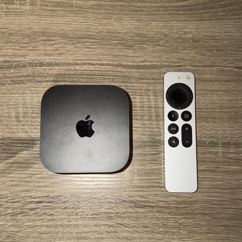 Apple TV 4K med fjernkontroll i svart. Mediespiller for tilkobling til TV via HDMI for strømming av innhold og bruk av apper. HDMI og strømkabel medfølger.