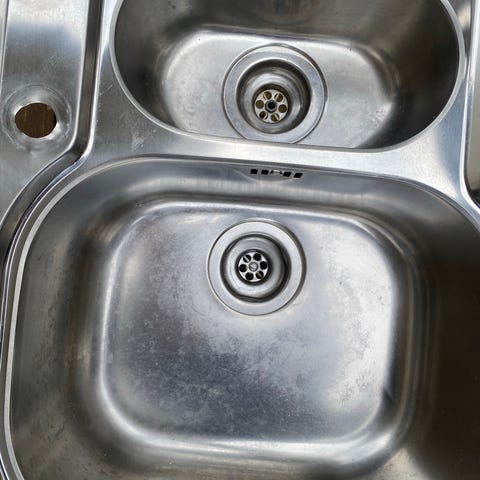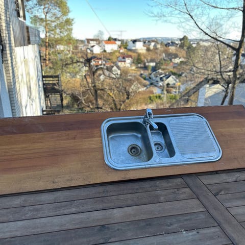 Kjøkkenbenk med integrert dobbel oppvaskkum i rustfritt stål. Den ene kummen er stor og dyp, den andre er smalere med egen rist og avrenningsfelt. Benkeplaten har rillet felt for avrenning ved siden av kummene.