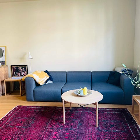 Første bilde (blå sofa) viser bilde av sofa som er til salgs. Puff medfølger men er satt i bod og derfor ikke med på bilde. De andre bildene er hentet fra Bohus for å vise hvordan sofaen kan brukes med puff.