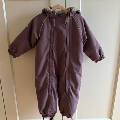 Brukt i ca en halvtime i tørt vær før vi fant ut at den var for liten, fremstår ny og ubrukt. Virker liten i størrelsen da vi har en dress fra Newbie i str 86 som er romsligere enn denne.