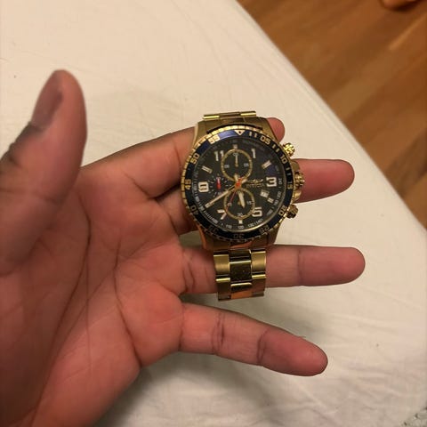 Klokken er pent brukt og fungerer som den skal. Solid lenke i stål med gullfargede detaljer og en stor, tydelig skive.