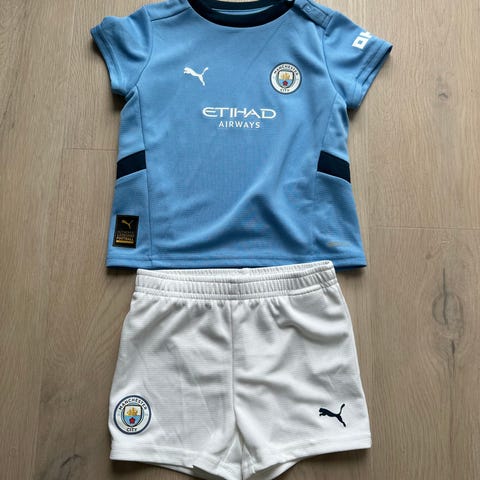 Nike Liverpool fotballdraktsett for barn i størrelse 74. Settet består av kortermet fotballtrøye i hvit og grønn med klubbemblem på brystet, svarte shorts med klubbemblem samt matchende sokker. Noe av trykker på fremsiden har dessverre gått bort i vask.