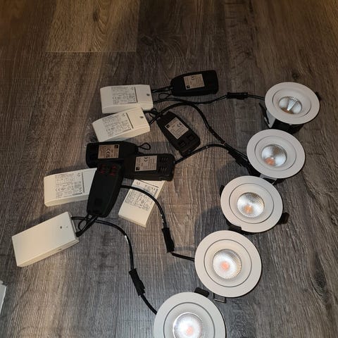 Selger 7 stk hvite LED skinnespotter med tilhørende skinnesystem.