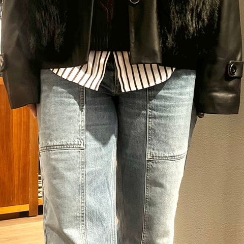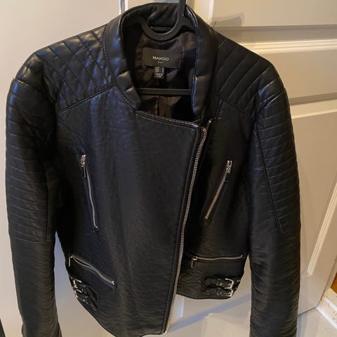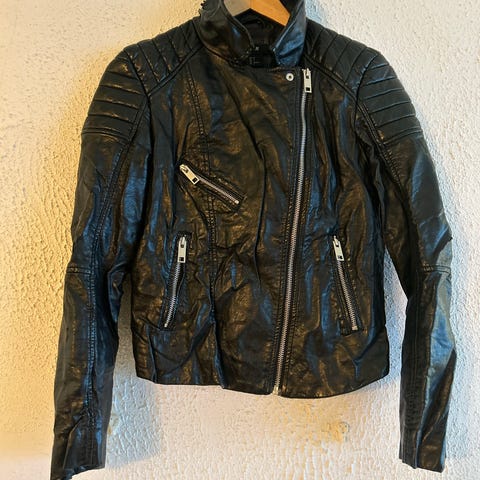 Selger en lite brukt skinnjakke fra Meotine i mykt og eksklusivt 100 % lammeskinn. Jakken har en klassisk biker-stil med skrå glidelås, quiltede detaljer på skuldre og ermer og dekorative spenner i sidene.