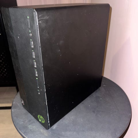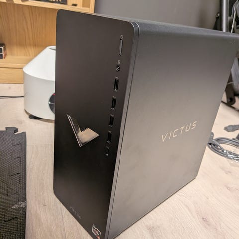 HP Victus stasjonær PC i svart kabinett. Fronten har flere USB-porter og hodetelefonutgang lett tilgjengelig. Kabinettet har ventilasjonsåpninger på siden for luftgjennomstrømming. Egnet som skrivebords-PC til generell bruk, spilling eller kontorarbeid, avhengig av den interne maskinvaren som er installert.