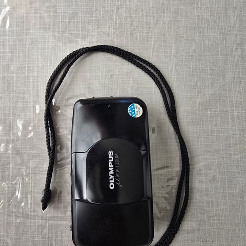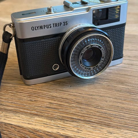 Olympus Trip 35 analogt kamera i sølv og svart. Kompakt 35 mm filmkamera med fast objektiv og innebygd lysmåler. Kameraet har mekanisk lukker og trenger ikke batteri til eksponeringen. Serienummeret er synlig på toppen av kameraet. Produsert i Japan og utstyrt med stativfeste i bunnen. Passer til 35 mm film og er egnet for generell fotografering med film.