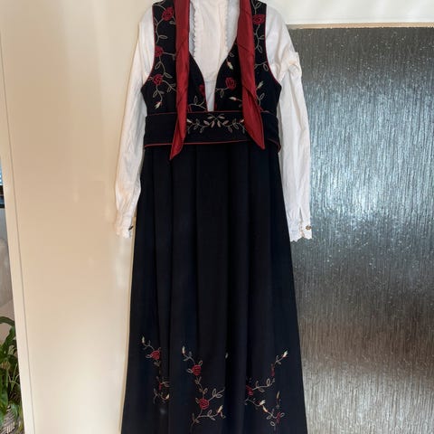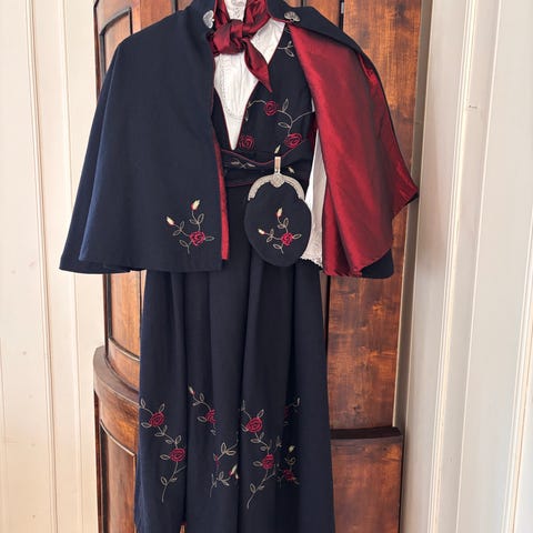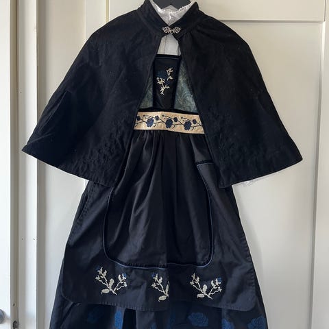 Meget pent og lite brukt Emma MAXEMILIA festdrakt i mørk marineblå med detaljer i burgunderrød og nydelige rosemotiver, str 14 år med veske og cape str 11-12 år (cape fra Name it, har brukt dette sammen med bunaden) selges samlet kr 1600,-.
