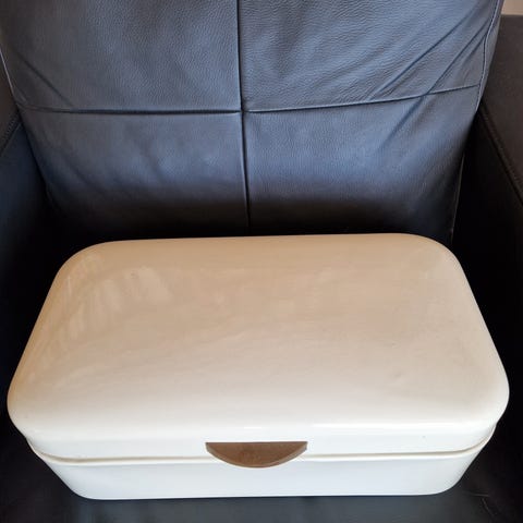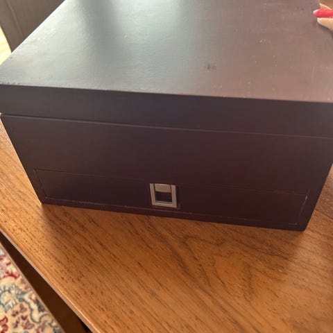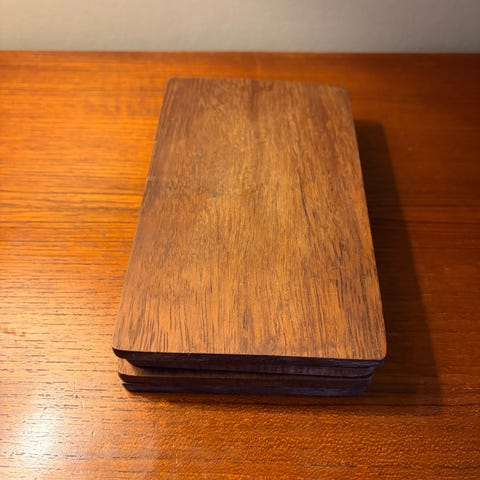Ellos teboks i tre. Boksen har lokk og flere rom innvendig som egner seg til oppbevaring av teposer eller annet tørt innhold på kjøkkenet. Yttersiden er mørkbeiset, og boksen har en enkel knapp foran for åpning av lokket.