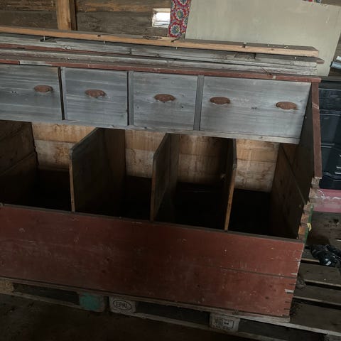 Skuffeseksjon i tre med mange skuffer i ulike størrelser. Utført i ubehandlet eller enkelt behandlet treverk med synlige knotter på hver skuff. Møbelet egner seg til oppbevaring i verksted, bod, garasje eller lignende, der det er behov for sortering av mindre gjenstander og verktøy. Trenger litt kjærlighet.