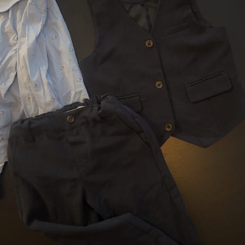 Jakke, vest, bukse, kort- og langermet hvit skjorte brukt to ganger selges smalet.