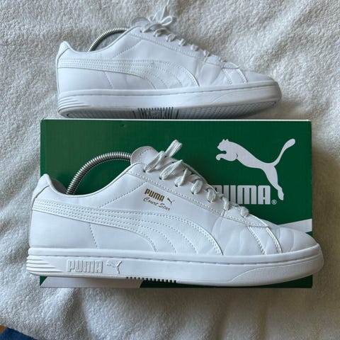 Hvite sneakers fra Puma selges.