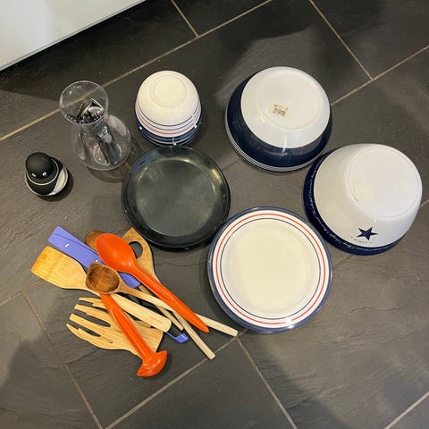 Kjøkkenting og servise i blandet parti. Inneholder ulike boller i plast, tallerkener, mugger, drikkebegre, bestikk, rivjern, sitruspresse i glass, målebeger, lokk og diverse små kjøkkenredskaper. Egnet til daglig bruk på kjøkken, matlaging og servering. Selges samlet som vist på bildene.