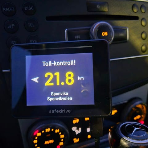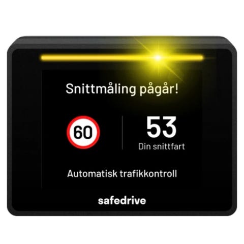 Safedrive trafikkvarsler for bil i svart. Enheten monteres i bilen og har skjerm som viser varsler om blant annet kontroller, dyr i veibanen og andre trafikkrelaterte hendelser. Varsleren kobles til strøm via kabel og plasseres vanligvis på dashbordet. Passer for bruk i personbil og gir visuell og lydmessig informasjon under kjøring.