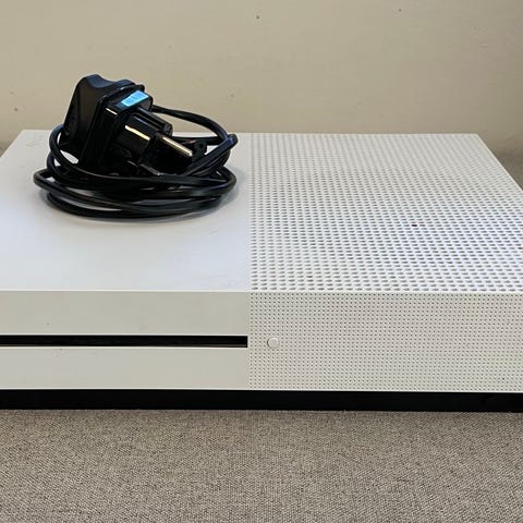 Microsoft Xbox One S spillkonsoll i hvit farge. Konsollen har innebygd Blu-ray-spiller og støtte for HDMI-tilkobling. På baksiden finnes flere porter, blant annet HDMI inn/ut, USB-tilkoblinger, nettverksport (LAN) og strømtilkobling. Egnet for bruk med Xbox One-spill og ulike underholdningstjenester via nettverkstilkobling.