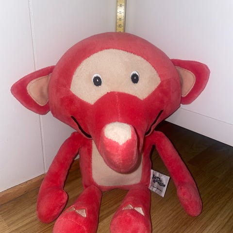 Bamsen er ca. 25 cm høy. Nyvasket i vaskemaskin.