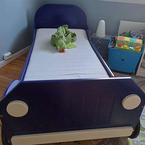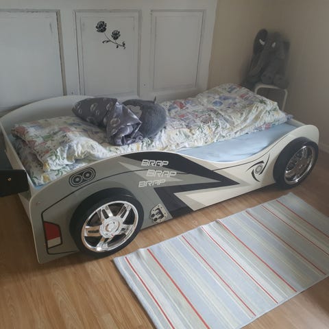 Selger en morsom barnebilseng formet som en blå racerbil fra Little Tikes. Perfekt for barn som elsker biler.