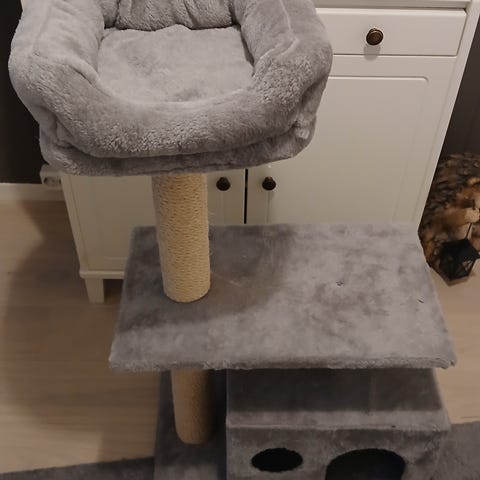 Klatrestativ for katt i grå farge med flere nivåer. Stativet har flere plattformer i ulike høyder og en lukket hule nederst som gir katten et skjermet hvilested. Støttene fungerer som klorestolper, noe som gir katten mulighet til å klore og strekke seg. Egnet for innendørs bruk for én eller flere katter som trenger klatre- og hvileplasser.