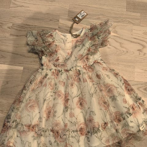 Newbie kjole for jente i størrelse 68. Kjolen er flerfarget med blomsterprint og har korte ermer med volanger. Den er laget av 100 % polyester, både ytterstoff og fôr. Passer til baby i ca. 4–6 måneder, avhengig av barnet. Egnet til hverdagsbruk eller enklere pyntede anledninger. Vaskes etter anvisning på plaggets vaskelapp.