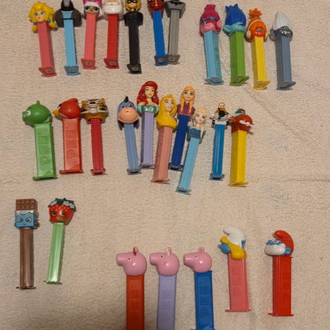 Pez samledispenser i plast, flerfarget. Samlingen består av flere ulike figurer og motiver på dispenserne, inkludert både løse dispensere og noen i originalemballasje. Dispenserne er laget i hard plast med ulike farger på både skaft og figurer. Egner seg som samleobjekter, leke eller til oppbevaring og utdeling av Pez-pastiller. Passer for barn og voksne som samler på Pez-dispenser eller figurrelaterte samleobjekter.