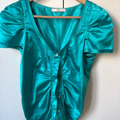 Bruuns Bazaar bluse i S. Blusen er flaskegrønn og laget i en silkekvalitet. Lappen er tatt bort, men det kjennes ut som silke. Den har løs passform med drapert utringning og korte, vide ermer. Veldig fin utringing!