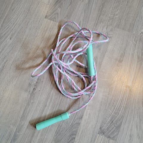 2 gamle hoppetau i plast. Det ene er 3,8 meter og det andre 4 meter langt + håndtak. Bruksmerker og en sprekk i det ene håndtaket - se siste bilde. Ellers hele.